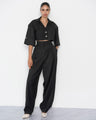 2 Piece set. Crop shirt with power shoulders paired with tailored button up barrel trousers.