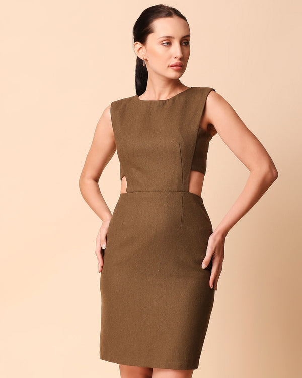 Woolen side cut-out detail dress. Best to wear it for a formal dinner or a formal occasion. Pair it with heels and statement jewelry or an accessory